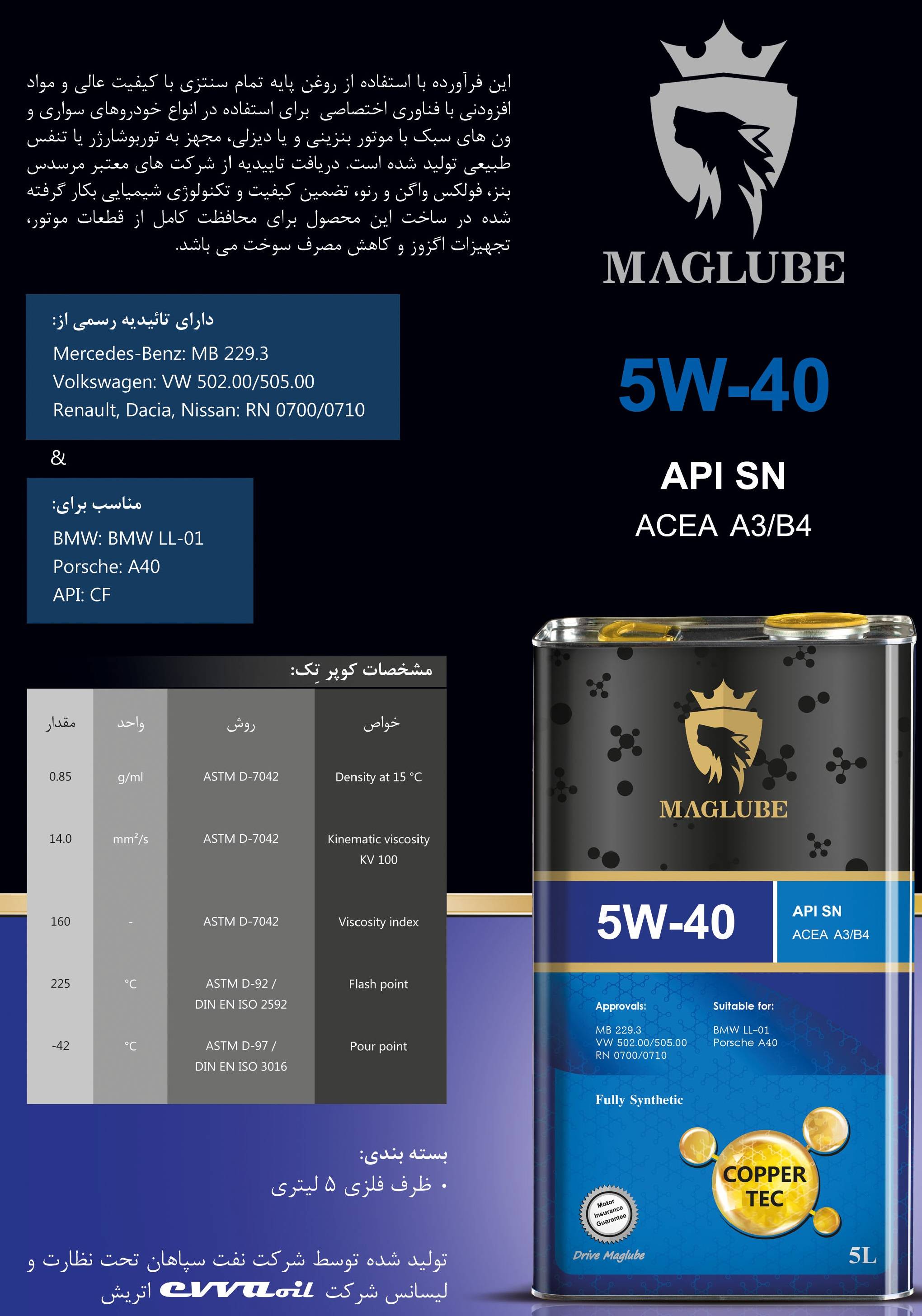 روغن موتور مگلوب کوپر تک 5W40 SN پنج لیتری تحت لیسانس افااویل اتریش و پر شده و بسته بندی شرکت نفت سپاهان مخصوص خودروهای بنزینی مدل بالای 2017مناسب برای بنز BMW و انواع خودروهای مدرن ژاپنی و کره ای وچینی.