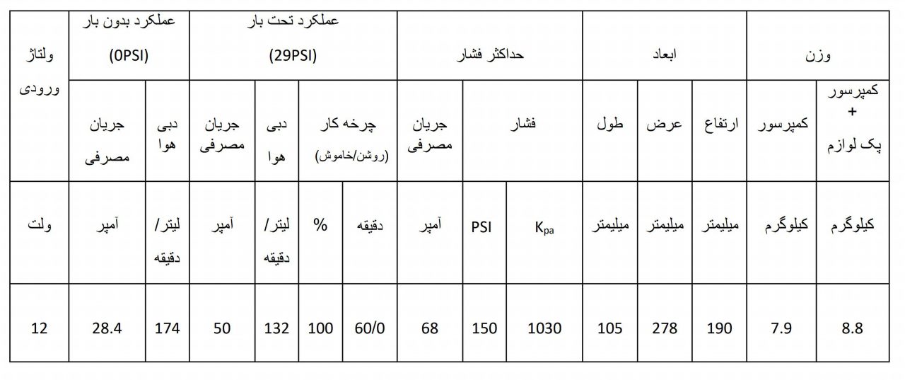 کمپرسور باد نکو دوسیلندر آنبورد به همراه پک لوازم کامل. دارای شلنگ فشار قوی و منعطف. با سیلندر و پیستون فلزی و دبی هوای بالا. ولتاژ برق ورودی 12 ولت.