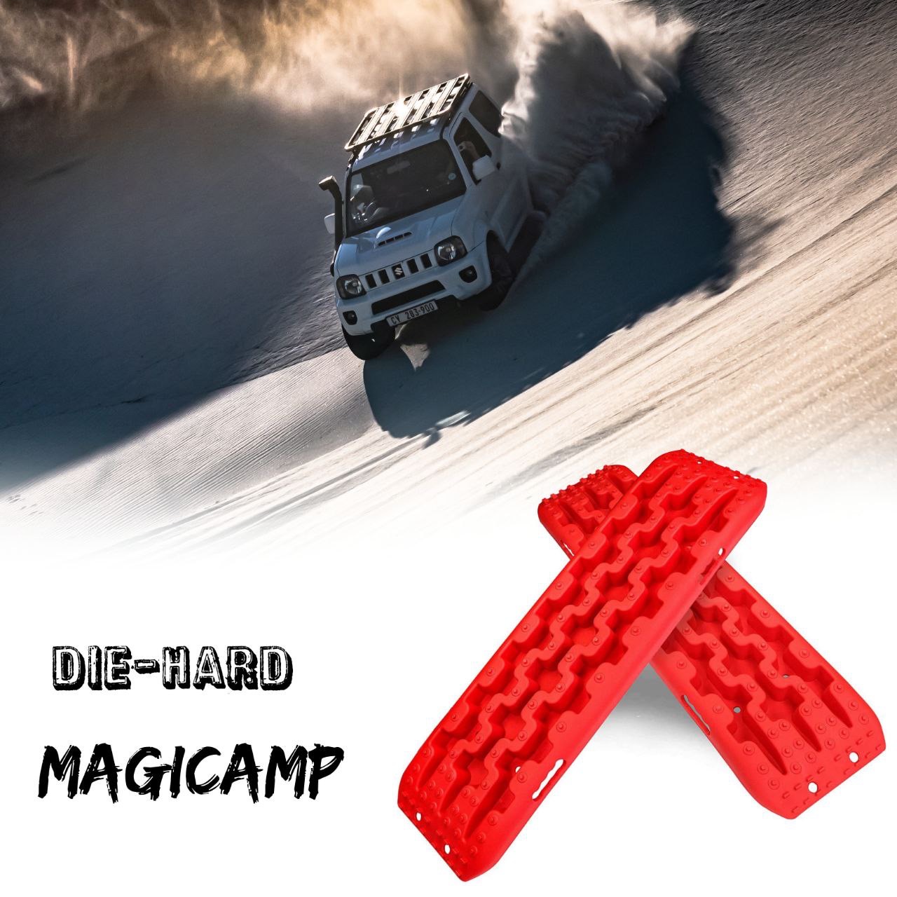 وافل برد جان سخت مجیکمپ، با طراحی مدرن و مهندسی شده دندانهها و برجستگیهای خود و لبههای پارویی با شیب کاملا مناسب، در تپههای شنی و ماسهای، رملها، جادههای برفی، گل و لای و هر مسیر ناهمواری که لاستیکهای خودرو آفرودی شما گیر کرده و شروع به چرخیدن میکند، با ایجاد کشش بیشتر و افزایش اصطکاک لاستیک، بیرون آمدن خودرو شما را تضمین میکند.